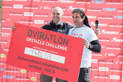 Piko na i izjemnemu dogodku je dodala podelitev čeka v vrednosti 1.480 EUR, ki ga je generalnemu direktorju URI – Soča mag. Robertu Cuglju v imenu organizatorja predal predsednik Športnega društva Oviratlon Luka Ravnič. Tudi letošnji oviratlon je bil namreč dobrodelno obarvan, saj je organizator en evro od vsake prijavnine podaril za nakup projektorja za interaktivno tablo v bolnišnični šoli.